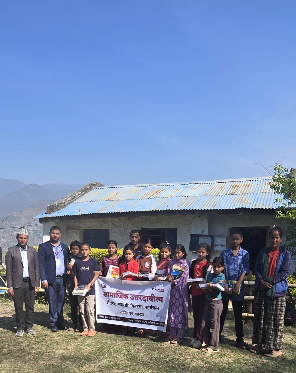 साँफेबगर ।एशियन लाइफ इन्स्योरेन्स कम्पनी लिमिटेडको १८ औँ वार्षिकोत्सवको अवसरमा १० जना विद्यार्थीहरुलाई शैक्षिक सामाग्री वितरण गरिएको छ। कम्पनीको १८ औँ वार्षिकोत्सवको अवसरमा अछाम जिल्लाको साँफेबगर नगरपालिका वडा नम्बर ४ मष्टामाण्डौ स्थित भगवती आधारभूत विद्यालयमा अध्ययनरत आर्थिक अवस्था कमजोर भएका १० जना विद्यार्थीहरुलाई शैक्षिक सामाग्री वितरण गरिएको हो।कम्पनीको सामाजिक उत्तरदायित्व अन्तर्गत विहीबार आयोजित कार्यक्रममा कापी, कलम लगायतका शैक्षिक सामाग्री विद्यार्थीहरुलाई हस्तान्तरण गरिएको हो। कार्यक्रममा एशियन लाइफ इन्स्योरेन्स कम्पनी लिमिटेडका कार्यालय प्रमुख पुर्ण बहादुर बिष्टले कम्पनीले आफ्नो वार्षिकोत्सवको अवसरमा समाज प्रति जिम्मेवारी बहन गर्दै यस्ता सहयोगात्मक कार्यक्रमहरु गर्दै आएको बताउनु भयो। उहाँले शिक्षा नै उज्ज्वल भविष्यको आधार भएकाले विद्यार्थीहरुलाई पढाईमा अझ प्रेरणा मिलोस् भन्ने उद्धेश्यले शैक्षिक सामाग्री वितरण गरिएको जानकारी दिनु भयो।